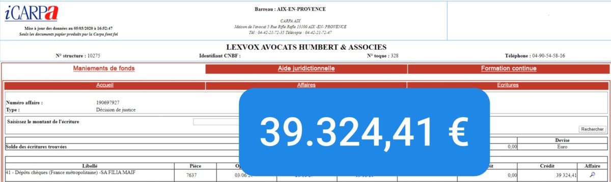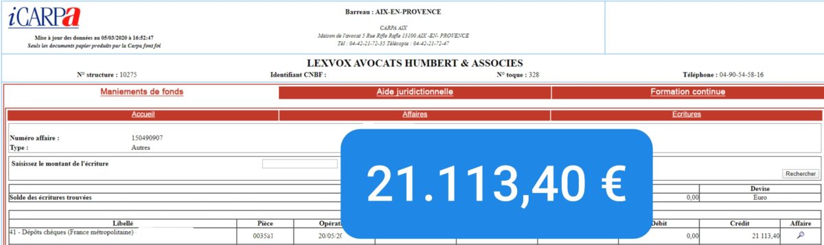En vous présentant nos résultats, nous souhaitons simplement vous donner un gage de notre sérieux et des succès qui seront prochainement les votre. Vous trouverez ci dessous des captures écrans des règlements édités par la CARPA, la caisse des avocats. Nous avons délibérément masqué les noms et les références des bénéficiaires dans un souci de secret professionnel.